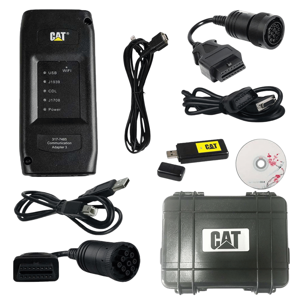 The CAT Caterpillar ET Diagnostic Adapter III 2025A/2019C (CAT ET 3) is a professional truck diagnostic tool for Caterpillar vehicles and engines, supporting diagnostics up to 2025 with both 2025A and 2019C software versions. It features WiFi and USB connectivity for accessing Electronic Control Modules (ECMs), enabling fault code reading, parameter monitoring, and ECM reprogramming on CAT trucks, excavators, and industrial engines. The kit includes the CAT ET3 Adapter III, USB and J1939/J1708 cables (6PIN, 9PIN, 14PIN), a software DVD, and a plastic box; optional bundles may include a pre-installed laptop like the Lenovo T420 or X230.