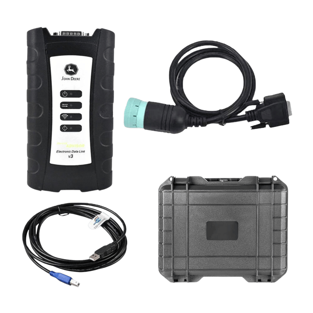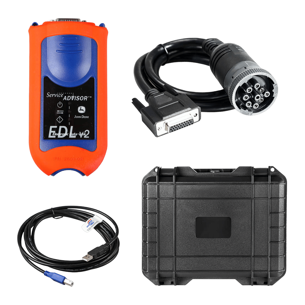 The John Deere Service Advisor EDL V2 Truck Diagnostic Kit with V5.3.225 AG (Agriculture) and CF (Construction & Forestry) Software is a comprehensive diagnostic tool for John Deere tractors, trucks, and construction equipment up to 2024. It supports troubleshooting, ECU reprogramming, and parameter adjustments in multiple languages (English, French, Spanish, etc.), using a 9-pin Deutsch connector and USB interface for reliable connectivity. The kit includes the EDL V2 adapter, cables, and a 512GB SSD with pre-installed software, compatible with Windows 10/11, and requires a laptop for operation (not included)