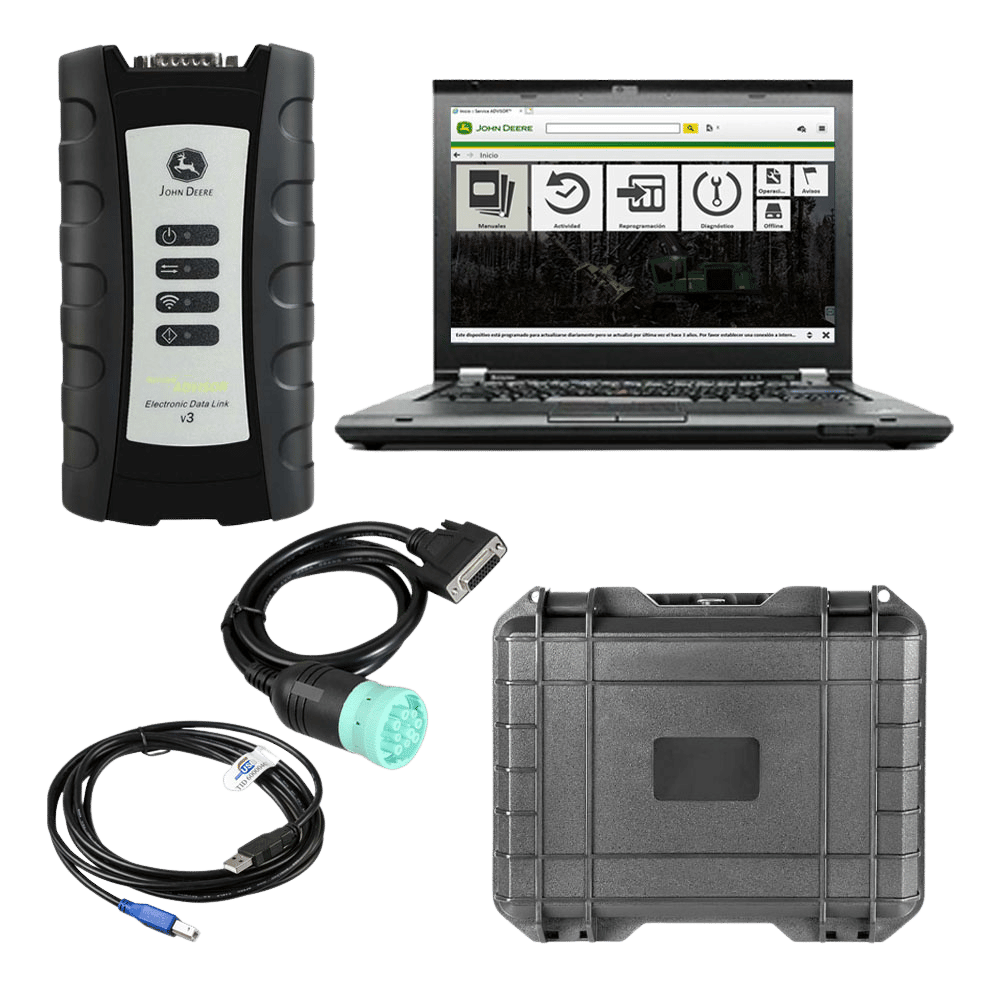 The V5.3.225 John Deere Service Advisor EDL V3 Electronic Data Link Truck Diagnostic Kit with a Lenovo T420 Laptop is a ready-to-use diagnostic solution for John Deere agricultural and construction equipment up to 2024. It includes the EDL V3 adapter, USB cable, 9-pin Deutsch adapter, and a 500GB SSD with pre-installed V5.3.225 AG (Agriculture) and CF (Construction & Forestry) software, supporting troubleshooting, ECU calibration, and programming in languages like English, French, and Spanish. The Lenovo T420 (Intel i5, 4GB RAM, 14-inch display) comes with all software activated, backed by a one-year warranty on hardware and software.